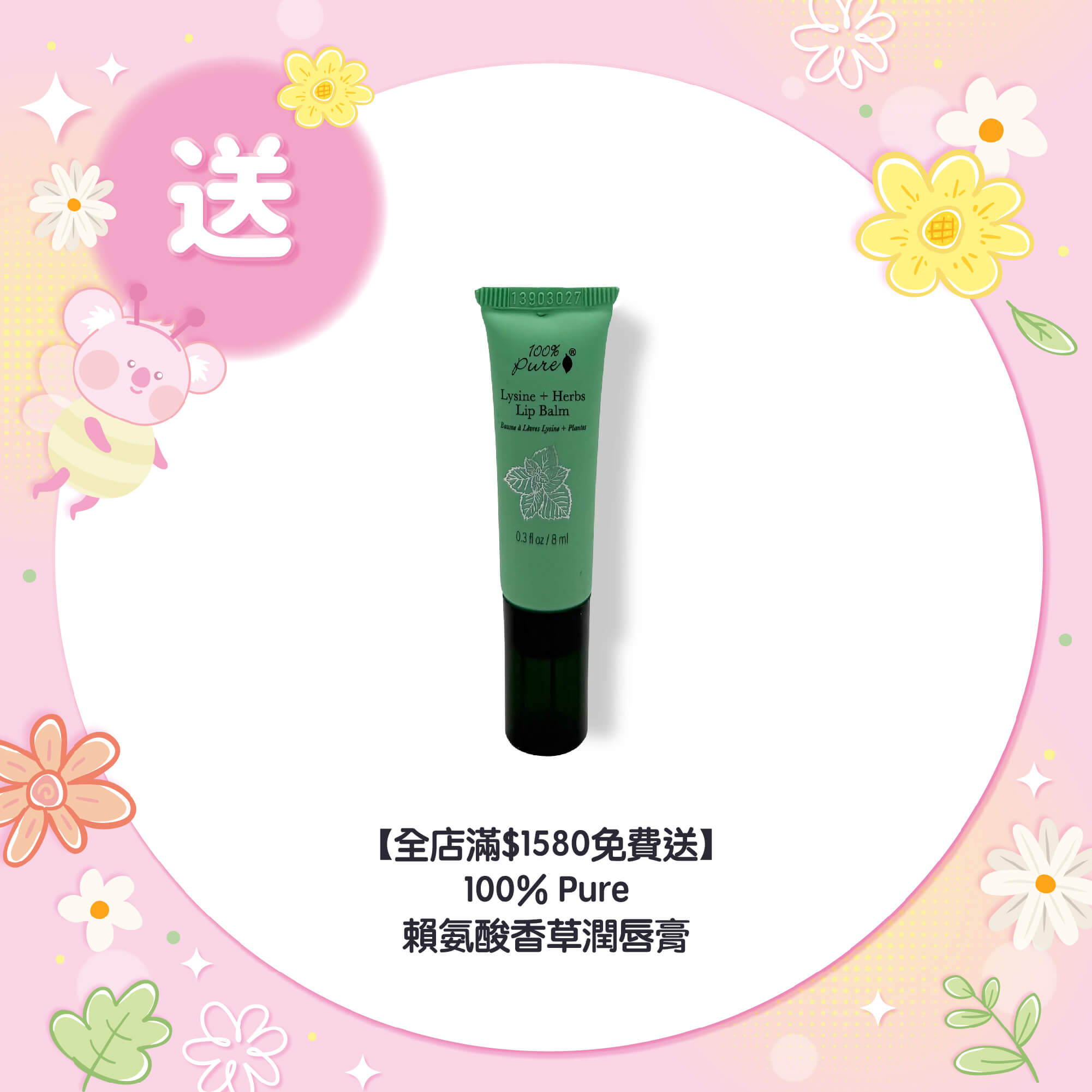 有機椰子油*,有機蜂蠟*,有機薄荷油*,有機向日葵籽油*,賴氨酸,有機檸檬香脂提取物*,蜂膠,柑桔(西柚)籽油,桉樹球(尤加利樹)油*,白千層(有機茶樹)油*,植物提取物 (有機甘草根*,紫錐菊葉,矮橡林葉,黑接骨木花,混合生育酚(維他命E)