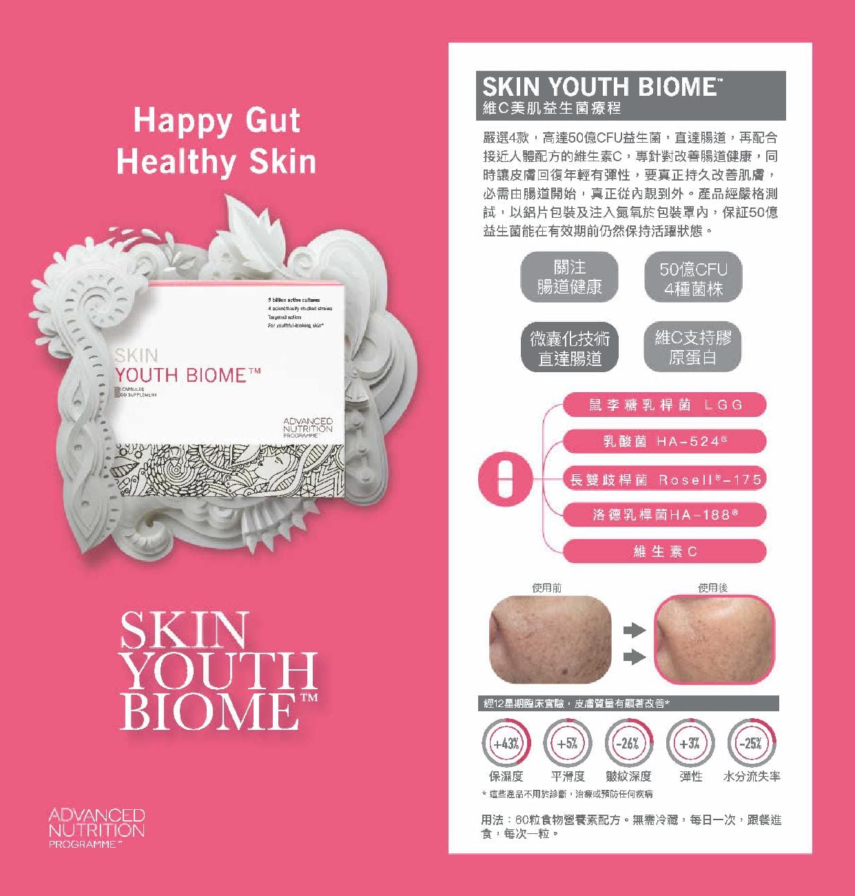 若想維持皮膚健康,除了勤力使用護膚品外,腸道健康亦十分重要,而益生菌就擔當著重要角性. 益生菌是促進腸道菌種平衡,增加宿主健康效益的活的微生物,而Skin Youth Biome則結合了四種獨特的益生菌和富含抗氧化劑的維生素C,這種組合不僅有助於支持和維持正常健康的腸道菌群,而且還有協同作用,改善皮膚水分,支持膠原蛋白形成,使皮膚更柔嫩年輕。